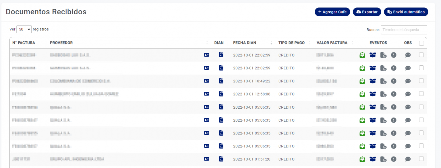Ejemplo, si quiero generar el evento «Acuse recibido de bienes y facturas» puedo filtrar las facturas con el evento «Acuse recibido de factura», así encontraras todas las facturas con el evento que puedo quiero generar.