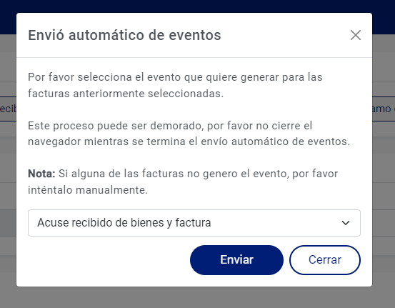 Si seguimos con el ejemplo que llevamos, filtramos las facturas que ya tienen el evento de «Acuse recibido» y le generaremos el evento de «Acuse recibido de bienes y factura», lo seleccionamos y le damos click en enviar.