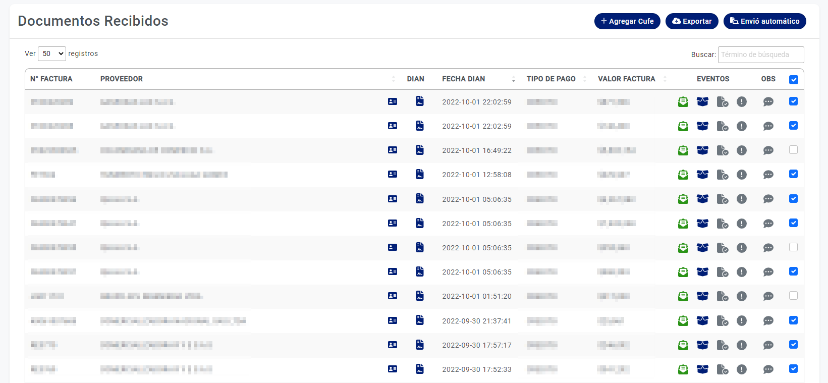En el siguiente paso se deben seleccionar las facturas a las que se le quiere hacer el evento. Puedes escoger uno por uno, dado al caso que no ha todos les quiera hacer el evento o en el encabezado de la tabla, puedes seleccionarlo para que todas las facturas sean seleccionadas.