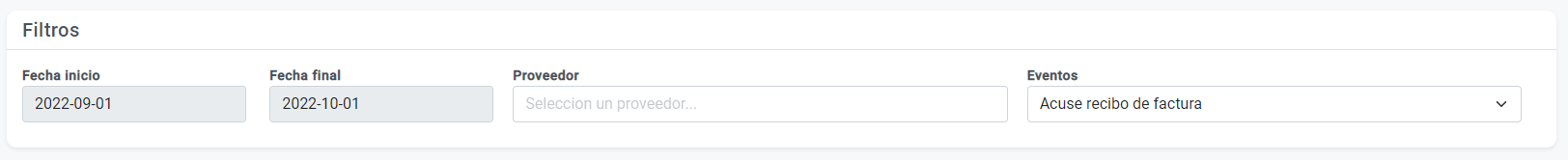Ejemplo, si quiero generar el evento «Acuse recibido de bienes y facturas» puedo filtrar las facturas con el evento «Acuse recibido de factura», así encontraras todas las facturas con el evento que puedo quiero generar.